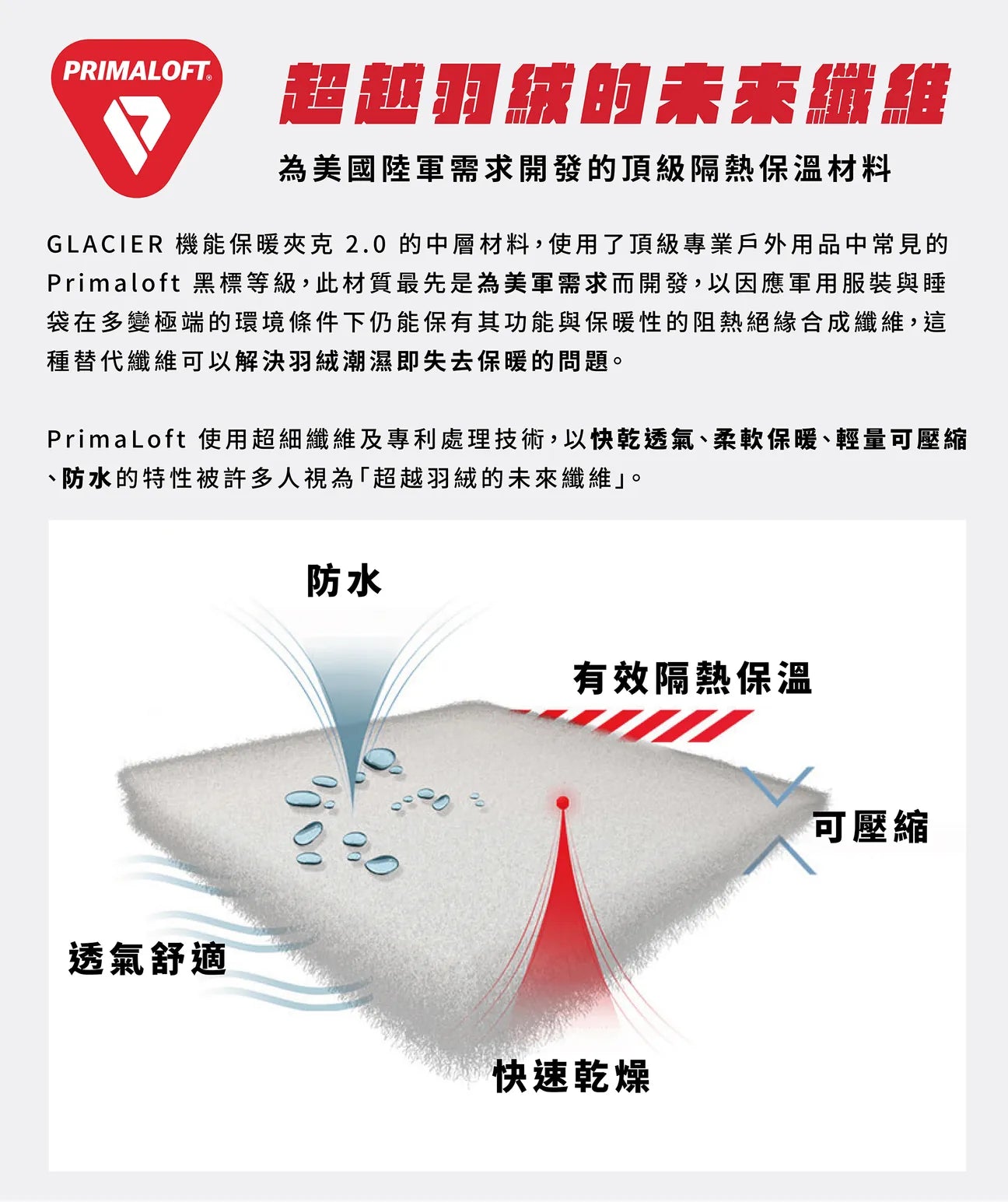 使用了專業戶外用品中頂級的 PrimaLoft® 專利隔熱材質,GLACIER機能保暖夾克 2.0 是一件極輕、柔軟且不管在怎樣的寒冷氣候都能夠提供適當保暖的外衣。