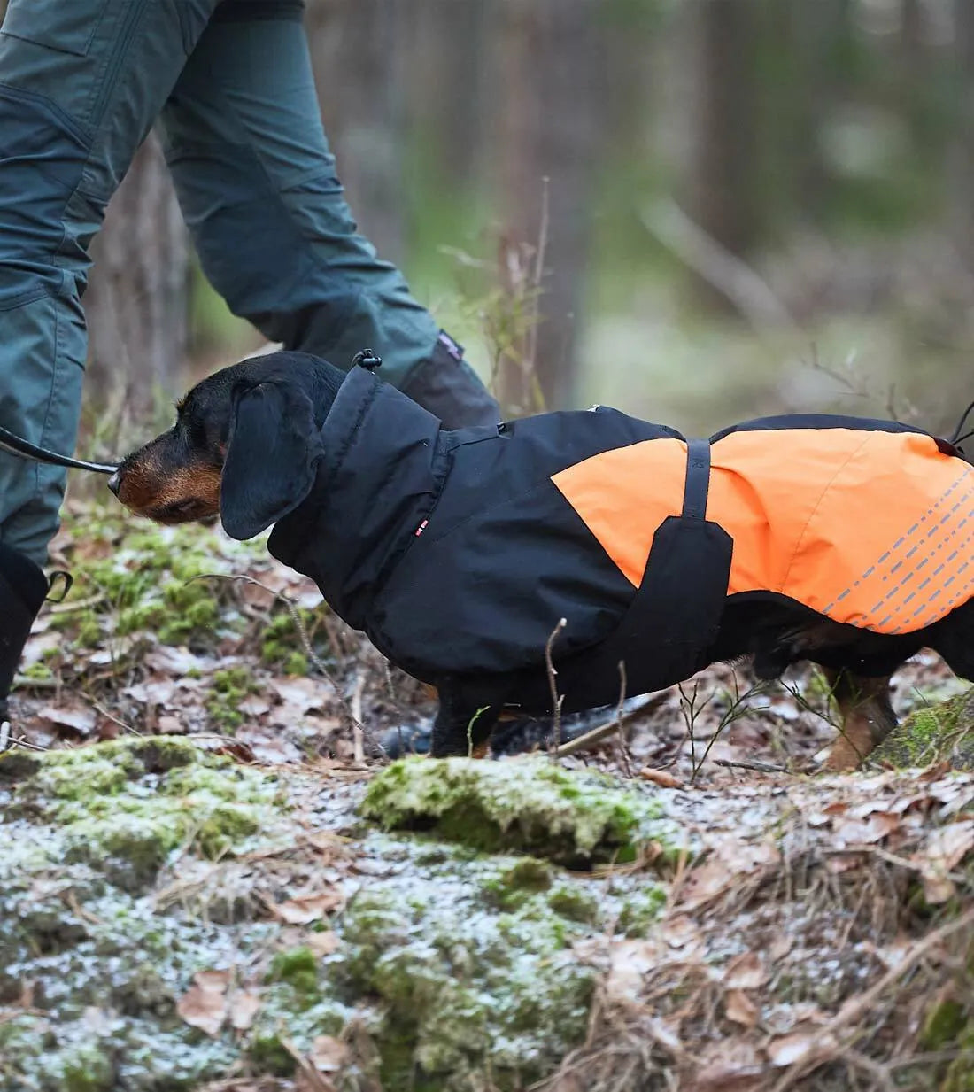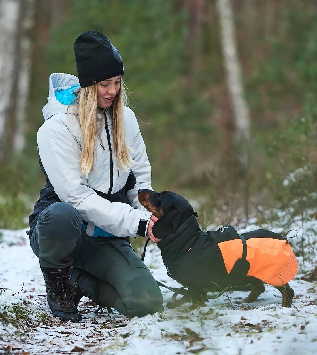狗體工學的設計來讓保暖夾克更為合身舒適,腰帶扣環可以調整長度,並且後腿綁帶可以讓保暖衣不會隨使用或是颳風而揚起。特殊設計的牽繩開口讓毛孩可以在裡面穿著胸背帶和項圈使用。除此之外,在腹部處也有著排水孔設計來避免水分堆積造成毛孩不適。